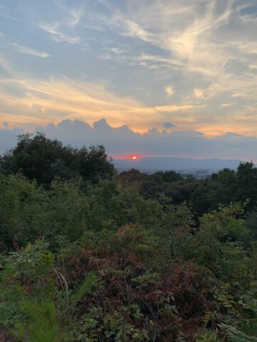 まず夕暮れに合わせて山頂に登り、地元の夕焼けを見て感傷に浸ります。