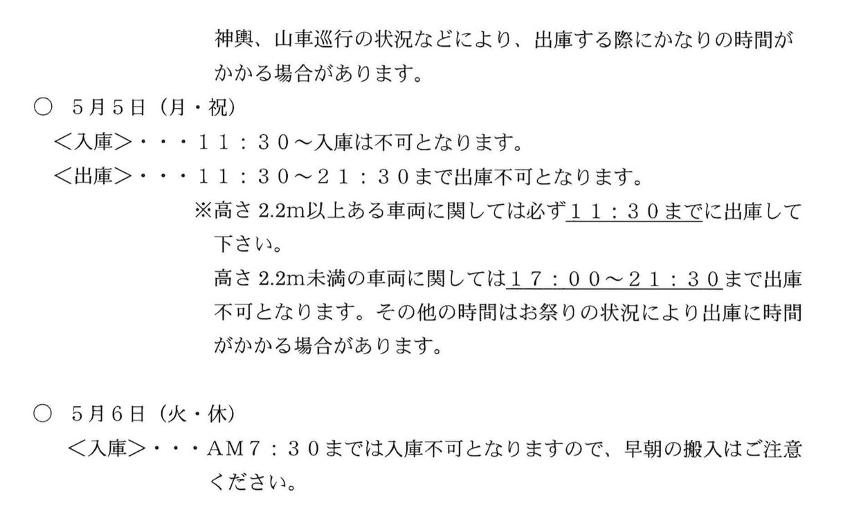 規制のある日に駐車場を利用する場合は、規制時間の30分前には出庫する様に余裕をもって対応して下さい。