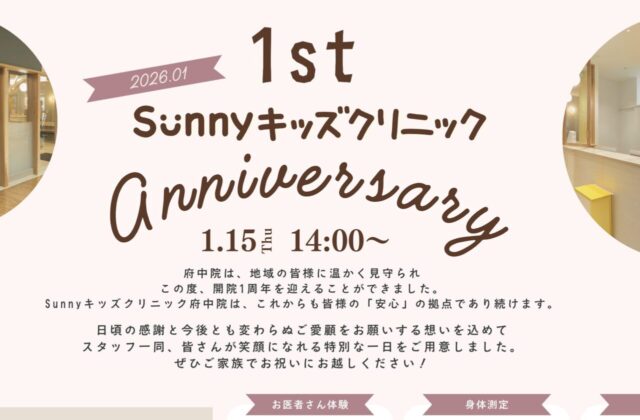 いつもSunnyキッズクリニック府中院をご利用いただき、誠にありがとうございます。この度、当院は2026年1月をもちまして、開院1周年を迎えることとなりました!これもひとえに、地域の患者様とそのご家族様、そして日々の診療を支えてくれるスタッ...