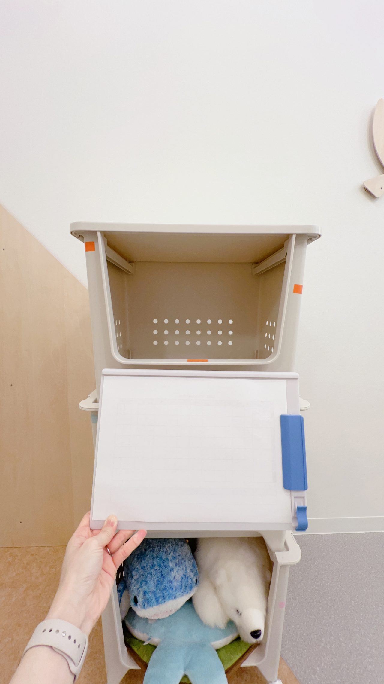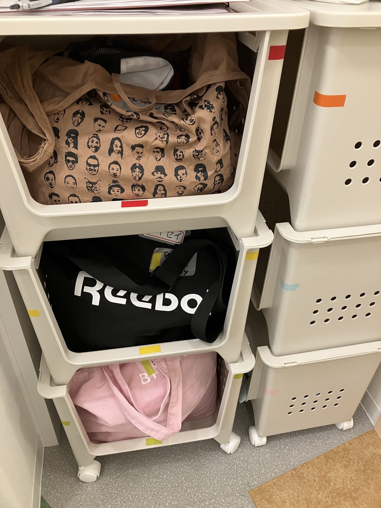 病児保育室では、お子様おひとりお一人に荷物BOXがあり、他のお子さんの物と混ざってしまわないようにそこにお持ちいただいたものを全て収納しております。