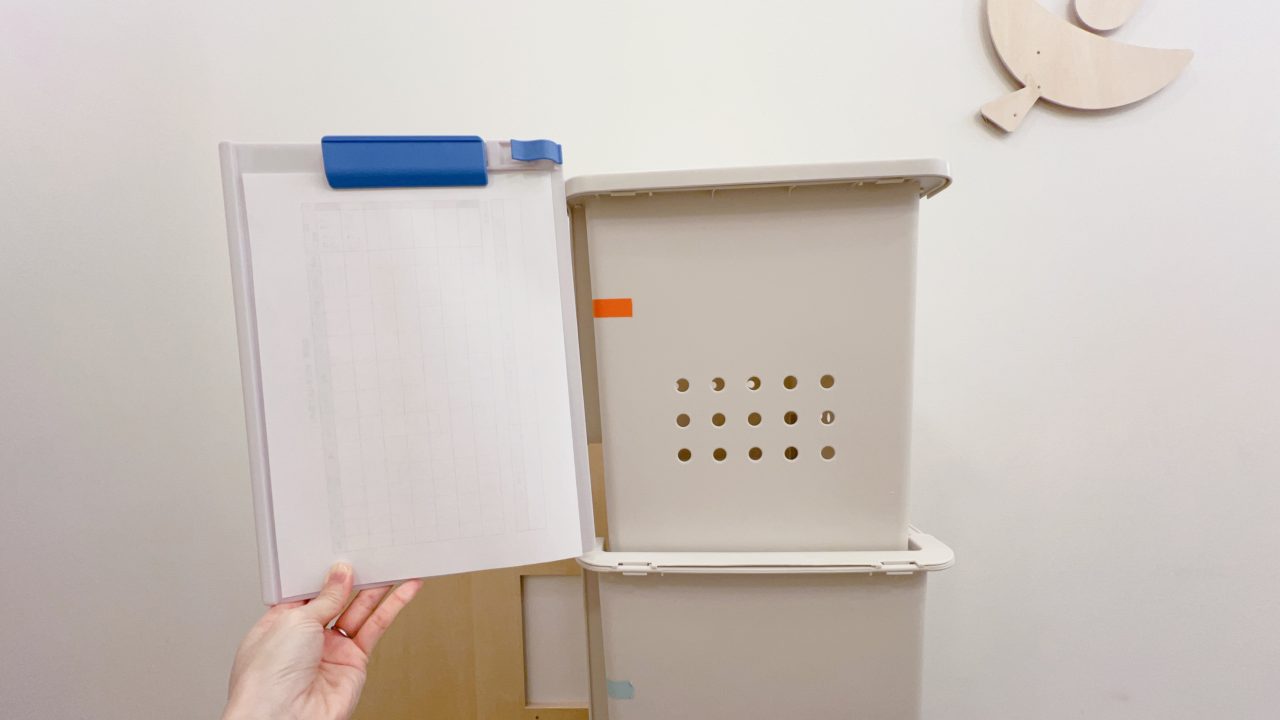 保育室の広さの関係で、お一人分の荷物BOXは下の写真ほどの大きさになります。一緒に写っているのはA4サイズの紙を挟めるバインダーです。比べていただくと大きさがよくわかるのではないでしょうか?
