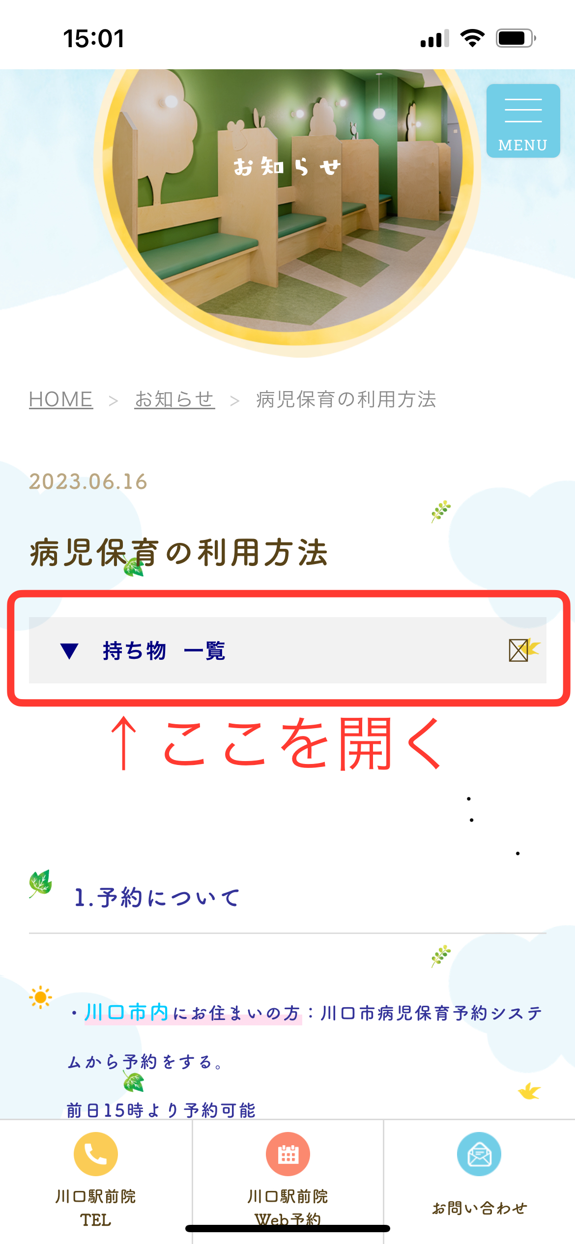 次に出てくる「病児保育の利用方法」の下にある「▼ 持ち物 一覧」をタップすると、上のように持ち物一覧が表示されますので、ぜひご確認いただければと思います✅