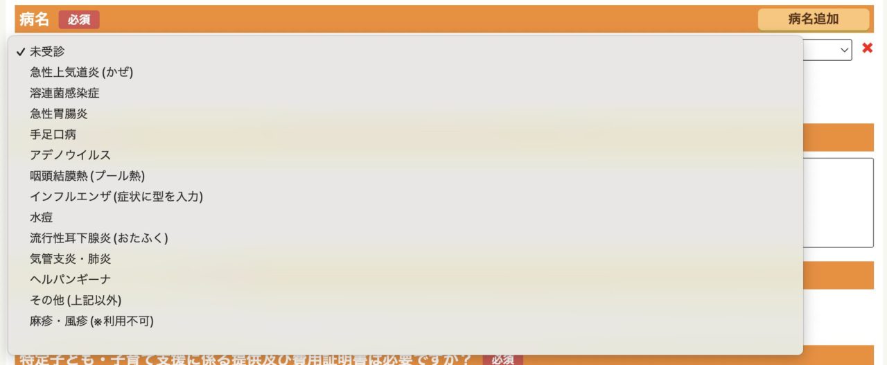 予約システムで病児保育室の予約をしようとすると、いくつかの項目にお子様の情報を入力する必要があるのですが、その中に下の写真のような「病名」という項目があります。