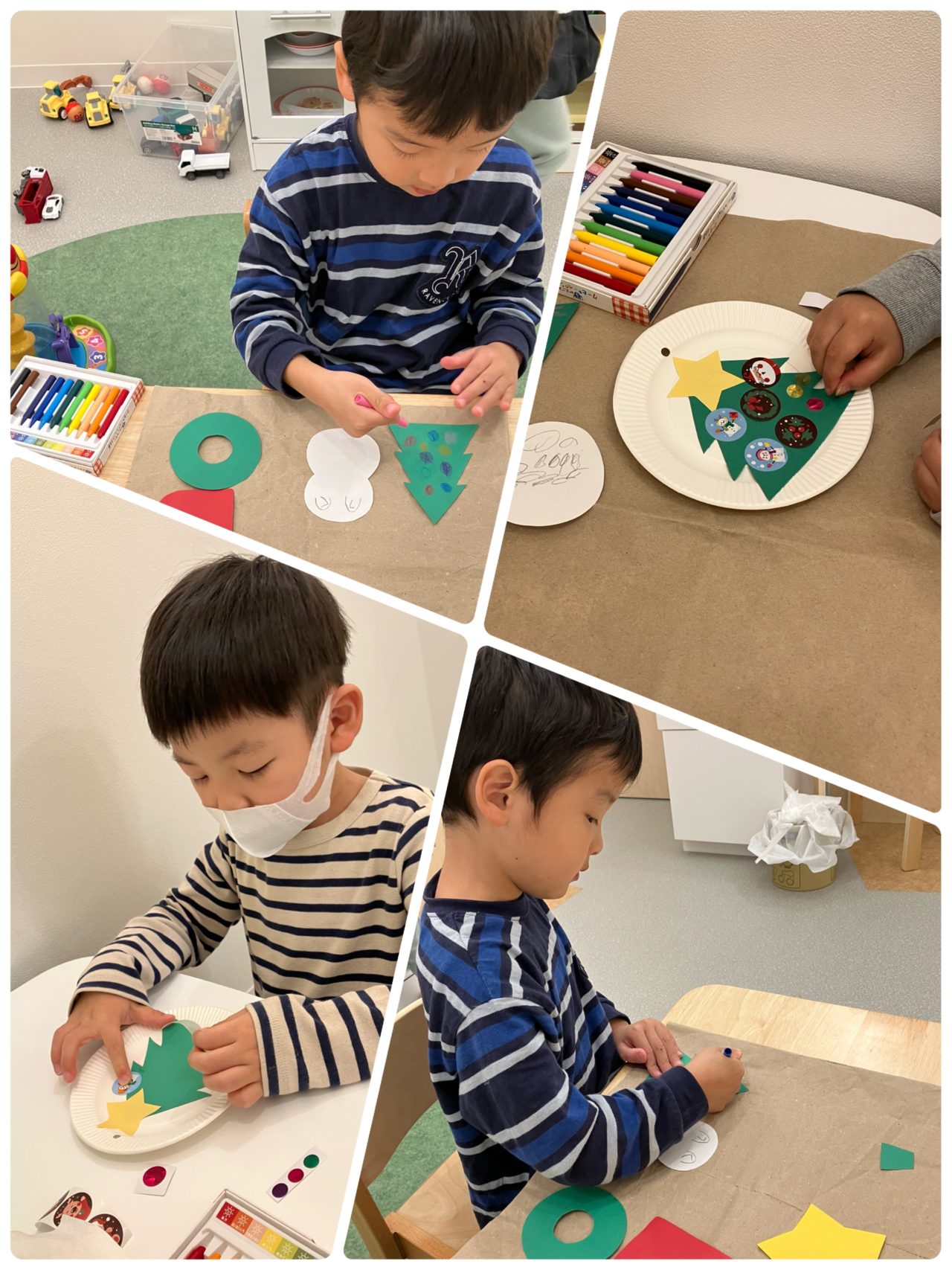 ガーランドのキットに絵を描いたり、クリスマスツリーを貼ってその周りにシールを貼ったり絵を描いたりします_φ(・_・