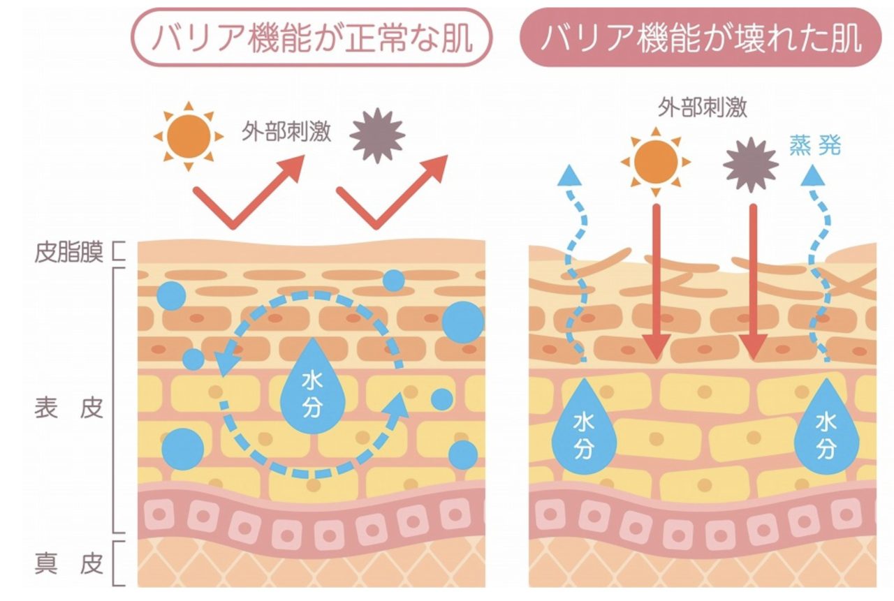 バリア機能の崩れてしまった肌に外部からのの刺激が加わり、トラブル(赤くなったり、痒みが起きたり、ぶつぶつしたり)になることがあります。