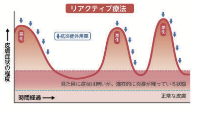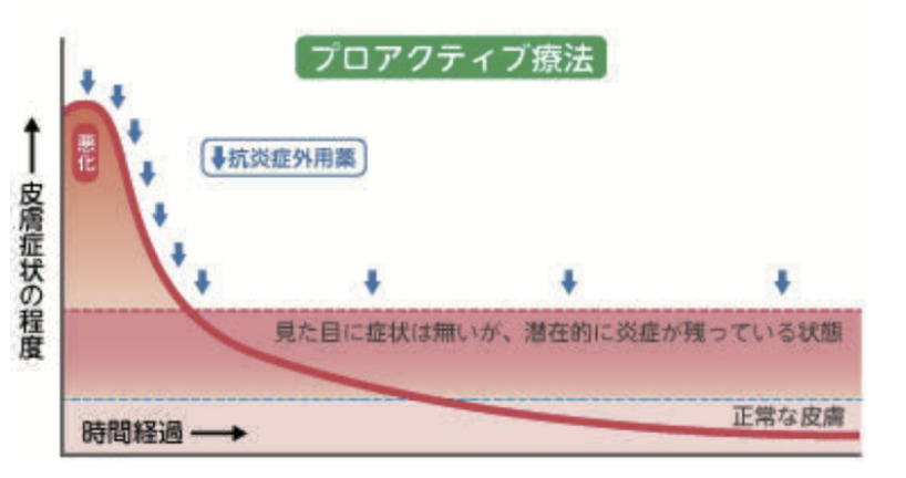 そして、塗るタイミングですが、眼に見える症状がなくなっても定期的に塗り続け、潜在して炎症が残っている状態→正常な皮膚になるまで徐々にステロイド剤を減量していく。