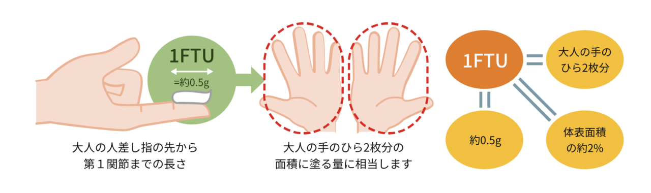 炎症を沈静化させるために「ステロイド剤」を使用することも多いですが、効果的に炎症を抑えリバウンドさせないためには塗り方にコツがあります。まずは、きちんとした容量を守ること。1FTU(ワンフィンガーチップユニット)といって、人差し指の第一関節までの長さ分のおよそ0.5gの軟膏が、大人の手のひら2枚分の面積に塗る量に相当します。また、ティッシュが張り付くくらいたっぷり塗るという目安もあります。