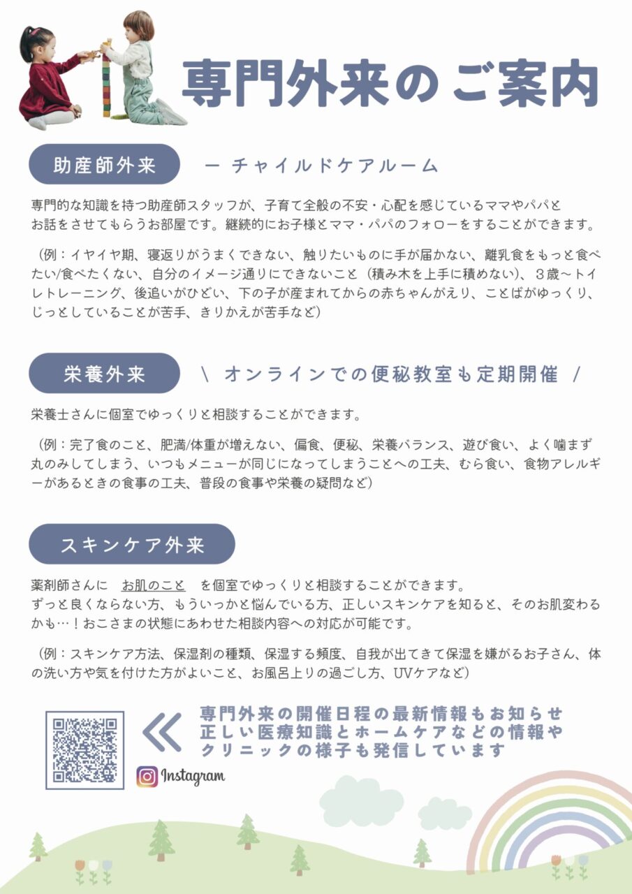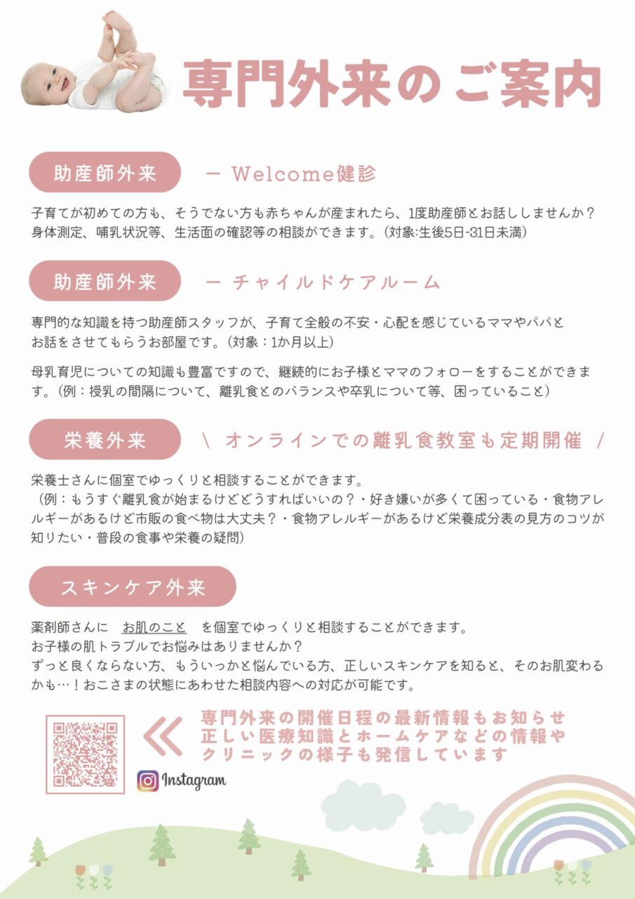 医療法人社団Sunnyでは、医師による診療だけでなく、各分野の専門スタッフがママ・パパに寄り添う「専門外来」を設けています。