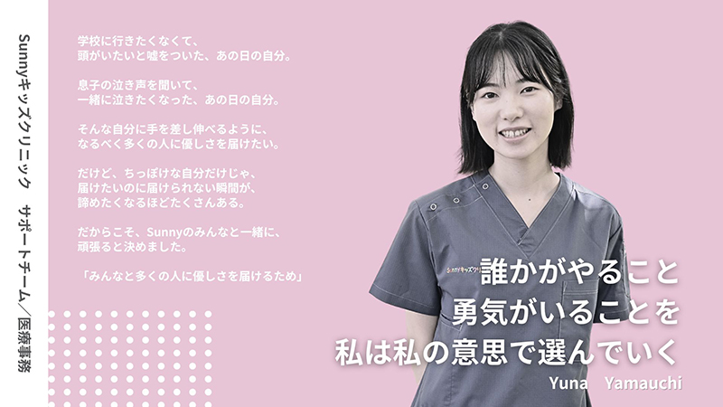 小児科クリニックは残業が多いというイメージがありますが、Sunnyは該当しません。患者さんのために身を削らなければならない、プライベートの時間も犠牲にしなければならないという意識はSunnyでは必要ありません。仕事をする時は集中して、それ以外の時間はしっかり自分の時間を大切にする。このように働くことで、より高いパフォーマンスをクリニックで発揮する事ができると考えています。